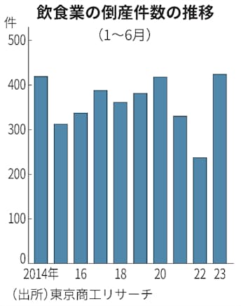 飲食店では人手不足も深刻化しており、営業機会を失っていることも業績悪化につながっている。倒産件数がこのペースで推移すれば、8月にも22年の年間倒産件数(522件)を超える可能性がある。